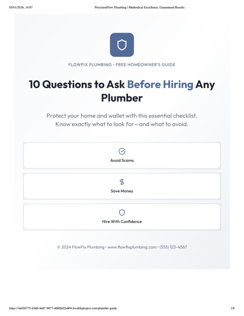 Download our free guide, “10 Questions to Ask Before Hiring Any Plumber.” This short PDF helps you avoid rushed work, unclear pricing, and poor workmanship. You’ll know what to ask before anyone starts the job, what answers to look for, and the warning signs to avoid. It’s a simple way to protect your home and feel confident choosing the right plumber.